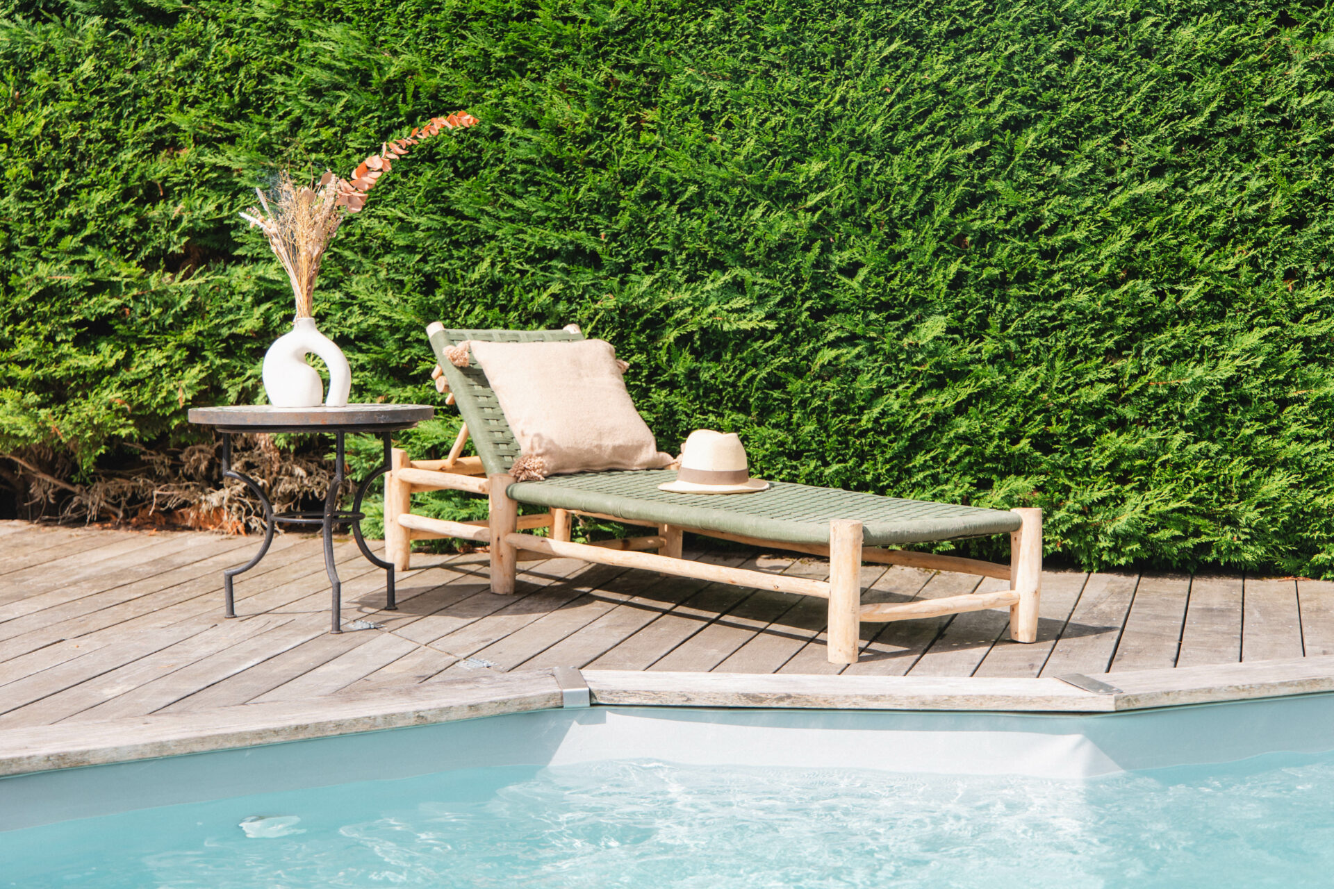 Découvrez ce transat marocain artisanal, entièrement fabriqué à la main par un petit atelier de Marrakech. Avec sa structure en eucalyptus et son tressage robuste, il apporte immédiatement une ambiance chaleureuse, naturelle et authentique à votre terrasse, jardin ou bord de piscine.